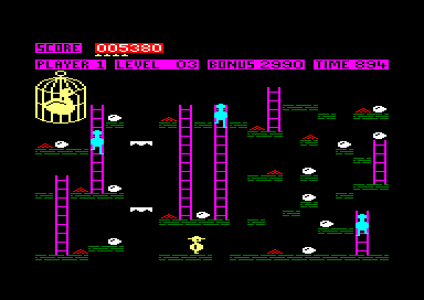 Vet another classic platform game that casts you in the role of Henhouse Harry, but it has some 236 more screens than Manic Miner The idea behind the game is just to go around a screen and collect all the egos while avoiding the various types of nasties that pursue you around the playing area Every screen is made up of two basic elements; platforms and ladders. Also dotted around the screens are occasional lifts. Collecting eggs gets you points and collecting the hen seed gets you a bonus. The biggest problem with Chuckie Egg is that it can soon become boring because of the similarities in the various screens. On the other hand, if you particularly enjoy platform games, then this one is almost fright-eningly addictive and promotes a need to get higher and higher scores Overall AMTIX! rating 69%