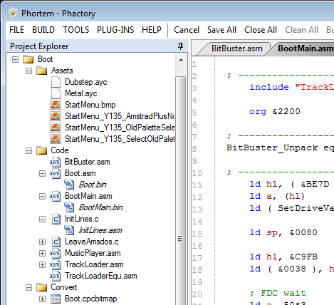 Phactory (a development environment targetting Amstrad CPC) and Phortem (demo released last year) complete source-codes are now available for download here. Those projects are not maintained anymore, please don't ask for support. This is released today with agreements of Ced (graphist on Phortem) and Arnoldemu (trackloader toolchain). Win7+ required.