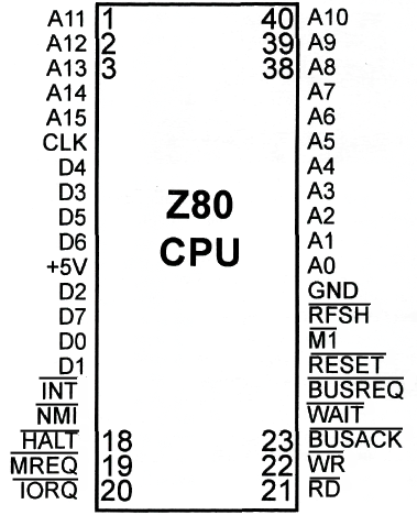 Nous allons parallèlement traiter du Z80 dans un cadre général et dans celui de son utilisation sur CPC. Ainsi, L'assembleur tu maîtriseras, la machine tu comprendras, plus aucun bug tu n 'auras, et enfin tu jouiras. Etudions les différentes broches du Z80 :