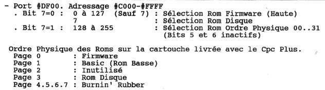 Lorsque la page I/O de l'Asic est ON, celle-ci est prioritaire par rapport à toutes les Rams connectables entre #4000 et #7FFF. LA CONNEXION DES ROMS Hem... pas de confusion... Le CPC Plus est capable de supporter un nombre maximum de 32 Roms de 16 K chacune (Ce qui porte la capacité maximale des Roms à 512 K). Les Roms peuvent être gérées par les anciens mécanismes du CPC via le Gate Array (Fct° RMR) et le port #DF00 (Sélection du N° de Rom Haute). Cependant, le port #DF00 ne gère pas un ordre physique des Roms puisque la Rom Basic porte le numéro 00 et la Rom disque le numéro 07. Il est cependant possible de sélectionner les Roms du Plus dans leur ordre physique, ceci en plaçant le bit 7 du port #DF00 à 1 ( Ce qui nous donnera donc une valeur de 128 à 159). Résumons les modes de sélection des roms du CPC Plus: