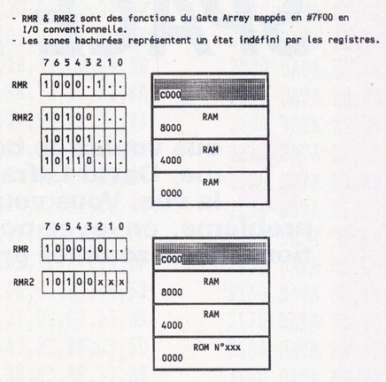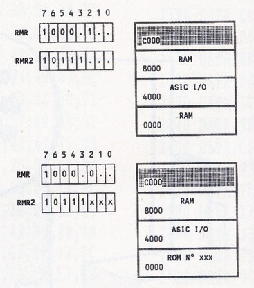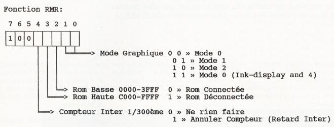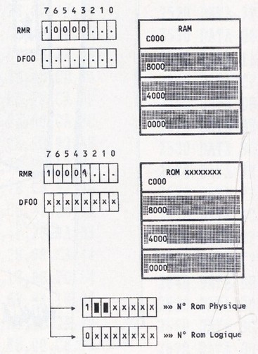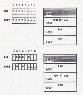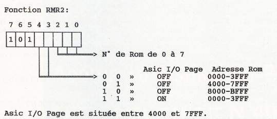 Détaillons un peu la fonction RMR2 (Je vous conseille la lecture du Cent pour Cent N° 35 pages 44, 45 si vous voulez plus d'informations sur le mode RMR). Les bits 0, 1, et 2 permettent de sélectionner un N° de Rom, ce numéro allant de 0 à 7. Je reviendrais sur le fonctionnement des Roms un peu plus loin... Les bits 3 et 4 permettent: