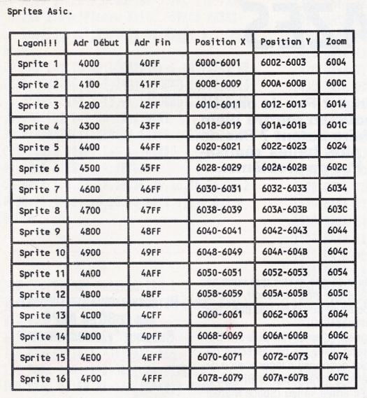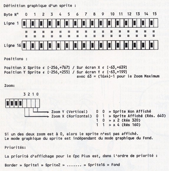 Petit défi: J'attends de vous, lecteurs, une routine permettant de tester si le CPC est un Plus ou un CPC ordinaire (Et sans beurre...). Réponse dans 2 mois! Et pour finir la prose de ce mois, voici une autre table résumant la gestion hardware des sprites du Plus... (Pfewww, j'en ai ma claque des tables!!).