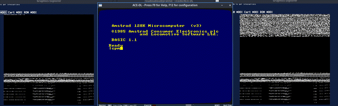 Deuxième exemple avec le jeu Nord & Sud, avec un loader CPM. Le démarrage CPM va charger le secteur de boot à l'adresse #100 (tout en haut de la mémoire). Ensuite, le jeu utilise ensuite la ROM système pour charger son écran logo. Une fois le tatou chargé, il déconnecte définitivement la ROM haute qu'on voit disparaitre du mapping émulateur à droite en bas. Ensuite les données pour l'intro sont chargées sans qu'une ROM soit connectée, les données écrasent allègrement la zone #A660-#C000 et on voit qu'il finit par se servir de la moitié de la mémoire pour animer le personnage sur son cheval (une technique dite du double-buffer, que nous aborderons... ...plus tard)