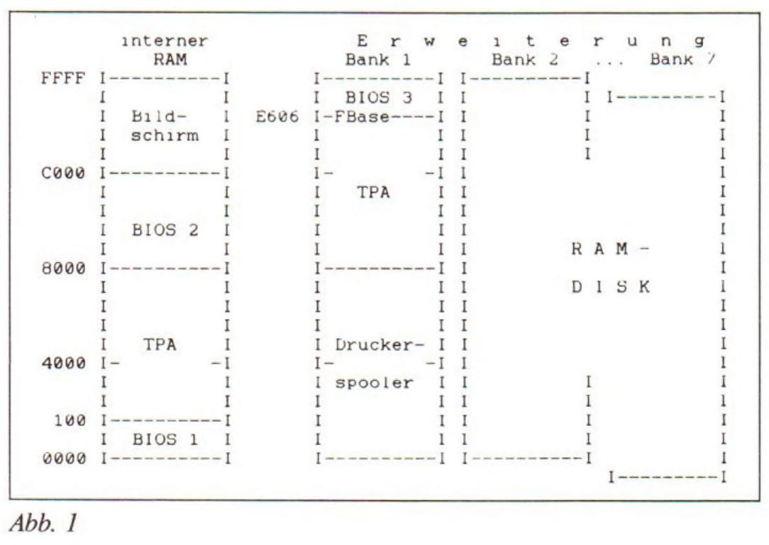 Dieser Beitrag wendet sich an die stolzen Besitzer des CPC 464 und der RAM-Erweiterung der Firma Vortex, die nicht auf eine 8-Bit Druckausgabe verzichten wollen, um z.B. Grafiken von Turbo-Pascal unter dem 62k-CP/M zu erstellen. Als Voraussetzung hierfür ist der Eingriff in den Rechner laut Heft 5'86 CPC-Intemational , der das 8. Bit unter Verwendung des Ports C Bit 5 des 8255 (Datenausgabe an Rekorder) bereitstellt, zu sehen. Zur Ansteuerung dieser neu geschaffenen Schnittstelle sind schon viele Programme veröffentlicht worden, die sich aber alle an die »Nur-Basic-Programmierer« richten. Was macht aber der »62k-CP/M-ler “? Der muß, ob er will oder nicht, in die Tiefen des BDOS und der Bankumschaltung hinabtauchen, um zu erforschen, wo er seine Routine zur erweiterten Druckerausgabe zu lassen hat. Dieser Beitrag soll Ihnen das Tieftauchen ersparen (vielleicht gibt es ja auch Nichtschwimmer unter den 62k-CP/M-lem), und einen Einblick in die Bankumschaltung geben. Alle Leser, zu denen sich noch nicht die RAM-Aufteilung unter dem 62k-CP/M herumgesprochen hat, sollten sich folgendes Schema näher betrachten, (s. Skizze 1—3) welches den Speicher Ihres Rechners zeigt: Dem aufmerksamen Leser wird auffallen, daß sich der RAM, wie er sich den Programmen unter 62k-CP/M darstellt, in verschiedenen Speicherbänken befindet. BIOS 1, das ist die CP/M Zero-Page, liegt in der Grundbank, dem eingebauten Speicher, genauso wie der untere Teil des TPA. Der obere Teil des TPA und ein weiterer Teil des BIOS liegt in der RAM-Erweiterung auf Bank 1. Durch die Elektronik der Bankumschaltung ist gewährleistet, daß ein CP/M-Programm diese beiden Speicherbereiche als durchgängigen RAM sieht. Der obere Bereich der Grundbank, mit BIOS 2 gekennzeichnet, beinhaltet im wesentlichen die allseits beliebten und nützlichen Sprungleisten und Routinen der Firmware, und ist ansonsten leer. Hier ist viel Platz für eigene Routinen, auch für die erweiterte Druckerausgabe (von 8600 bis A7FF) die den Firmware-Einsprung MC-PRINT-CHAR patched. Dieser Einsprung liegt bei BD2B der Grundbank. Wie bekommt man nun ein Programm in diesen Bereich? - Ganz einfach: man lädt es in den unteren TPA, schaltet den oberen Block des Speichers auf die Grundbank und verschiebt das Programm an die vorgesehene freie Stelle. Dann schaltet man den oberen Block zurück auf Bank 1 und springt WBOOT an. Fertig ist die auf 8 Bit erweiterte Druckerausga-be-Routine. Was man dazu kennen muß, sind freilich die Befehle zur Bankumschaltung. Derer gibt es jedoch zweierlei: Zum einen besitzt die Speichererweiterung ein Bank-Select-Register, was wir hier nicht brauchen, da für das 62k-CP/M immer nur die Bank 1 der Erweiterung aktiv ist, zum anderen werden Bit 5 und Bit 6 des Ports 7Fxx, der auch das Gate-Array anspricht, zum Blockselect und Mapping-Enable benutzt. Dabei bedeuten: BIT 5:1= Schalte Grundbank ab und blende Erweiterung ein 0 = Schalte Erweiterung ab und blende Grundbank ein BIT 6:1= Wähle oberen Block der Erweiterung an 0 = Wähle unteren Block der Erweiterung an Was wir hier brauchen ist nur das 5. Bit des Ports 7Fxx, da der obere Block der Speichererweiterung immer angewählt bleiben kann, es sei denn, man möchte im Drucker-Spooler irgend etwas manipulieren (natürlich nur von einem Programm aus, was oberhalb 8000 im RAM liegt, da es sich sonst selbst den Teppich unter den Füßen wegzieht). Da jetzt die grundlegenden Dinge bekannt sind, kann man sich getrost dem Listing zuwenden. Das Programm heißt CENTRONI.COM, wurde mit dem Wordstar geschrieben und danach durch den Makroassembler M80 und den Linker L80 genudelt. Sie können es auch einfach mit dem DDTZ eingeben, da es nicht so umfangreich ist. Wenn Sie das tun, brauchen Sie natürlich nicht auf die Label »Anfang« und »Done« bzw. »Ende« zu achten. Sie tippen einfach die Mnemonics ein und überall, wo im Op-Code ein Label steht, schauen Sie in der Spalte links nach und geben die entsprechenden Hex-Werte ein. Wie Sie sicher schon erraten haben, sind eigentlich 2 Programme nötig. Einmal die Drucker-Routine selber und als zweites ein Ladeprogramm, welches die Drucker-Routine in die Grundbank schiebt und den Restart bei BD2B durch einen Sprung auf die Routine ersetzt. Das Ladeprogramm beginnt bei »Start«. Als erstes wird durch DI der Interrupt gesperrt, was man bei Bankumschaltungen tunlichst immer machen sollte, da sich sonst der Rechner diskret verabschiedet. Danach wird die Bankumschaltung durch das Laden von BC mit 7FEE (7F = Portadresse, EE = »gängiger« Wert, der eigentlich alles so läßt wie es ist) vorbereitet und das Bit 5 in C zurückgesetzt (Sie erinnern sich: BIT 5=0 schaltet die Erweiterung ab und blendet die Grundbank ein). OUT (C),C vollbringt die Bankumschaltung. Die nächsten Befehle laden an die Stelle BD2B der Firmware-Sprungleiste den Sprung zur neuen Drucker-Routine, hier nach A400. Sie können sich auch einen anderen Speicherbereich aussuchen, der frei ist, müssen dann aber auch die Call-Adressen in der Drucker-Routine entsprechend ändern. Falls Sie mit dem Assembler arbeiten, ändern Sie nur den Wert in der Konstanten »Ziel« und hinter der Assembler-Direktive .Phase. Im Anschluß daran werden in die Register HL die Quelle, in DE das Ziel und in BC die Anzahl der zu verschiebenden Bytes geladen und mit LDIR das Verschieben des Programms realisiert. Zum glücklichen Ende gehört noch die Einblendung der Bank 1 der Erweiterung, das Zulassen des Interrupts und ein Jump nach 0000. Die Drucker-Routine tippen Sie direkt im Anschluß an das Ladeprogramm ein. Sie rettet zuerst BC und setzt das neue 7. Bit zu 0 (mit D7LOW). Dann wird untersucht, ob das auszugebende Zeichen das 7. Bit gesetzt hat (also >127 ist). Wenn nein wird es einfach ausgegeben (MCPRCA), ansonsten wird in XPRI1 das 7. Bit gesetzt, das Zeichen ausgegeben und das 7. Bit wieder rück- gesetzt. Zum Schluß wird BC restauriert und die Routine mit RET verlassen. Die beiden Routinen D7LOW un