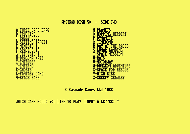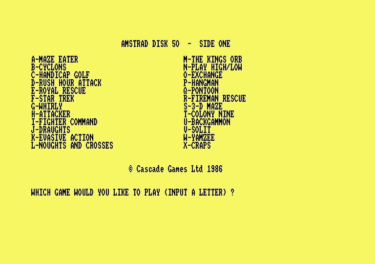 L'ARNAQUE DE LA SEMAINECette cassette est de couleur bleue, son éditeur s'appelle Cascade et ça tourne sur Amstrad. Le nom de cette horreur est, je cite : 50 Fantastic Games On One Cassette. Pour simplifier, disons 50 Games. Bon, c'est nul, mais alors vraiment nul. Pas la nullité classique et habituelle. Non, c'est encore pire que tous les plans foireux qui pourraient germer dans un cerveau d'éthylique sénile. Pourquoi est-ce si nul que ça ? C'est simple, tous les programmes sont en basic et nuls. Ça c'est très fort, d'habitude les éditeurs font nul et en assembleur. Eh non monsieur, chez Cascade nous faisons nul et en basic. Très fort, c'est le genre de plan du style : Mais enfin monsieur, c'est en Basic pour que les acheteurs puissent apprendre la programmation en décortiquant la substance de nos œuvres. Exemple de la première œuvre de cette cassette, les âmes sensibles sont priées de sortir, les autres doivent laisser la logique et le bon sens de côté. C'est fait ? D'accord c'est parti, essayez d'imaginer un Pac-Man en basse résolution. C'est déjà moche au possible, mais enlevez le son et supprimez tout ce qui concerne la gestion des commandes : c'est ça, vous commencez à avoir une petite idée. Fin de la description de la première œuvre de la cassette. Fin du premier exemple. Les personnes sensibles ne peuvent pas encore revenir, les autres doivent suivre la démarche décrite tout à l'heure. Deuxième exemple : prenez le premier exemple, enlevez le nom et le scénario, ajoutez des commandes inversées et nulles (très important). Le son reste le même. Le but : rester incompréhensible à tout prix. Voilà, vous avez Cyclons, mais en plus chouette. Fin du deuxième et dernier exemple. Non, c'est pas en examinant des listings foireux que vous pourrez apprendre à programmer. Donc Cascade n'a pas d'excuse, et c'est un vrai scandale que d'oser sortir une merde pareille. Une conclusion en forme de remarque, les éditeurs pourraient faire un effort pour nous éviter de perdre du temps. 50 Games de l'affreux Cascade pour rien, c'est nul n'achetez pas, ne piratez pas, n'y touchez pas, vous risqueriez d'être contaminés!