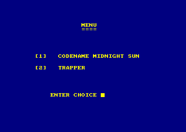 ★ INFO: La version de Codename Midnight Sun sur cette compilation ne contient ni une introduction ni un écran titre. L'écran titre de Trapper! était créé avec The Landscape Creator de Brian James Software. Les deux jeux étaient originellement programmés en 1985 et 1986 mais ils restaient inédit jusqu'à 2006 lorsque l'auteur vendait cette compilation sur eBay. Il ne permettait pas la distribution de ces jeux.