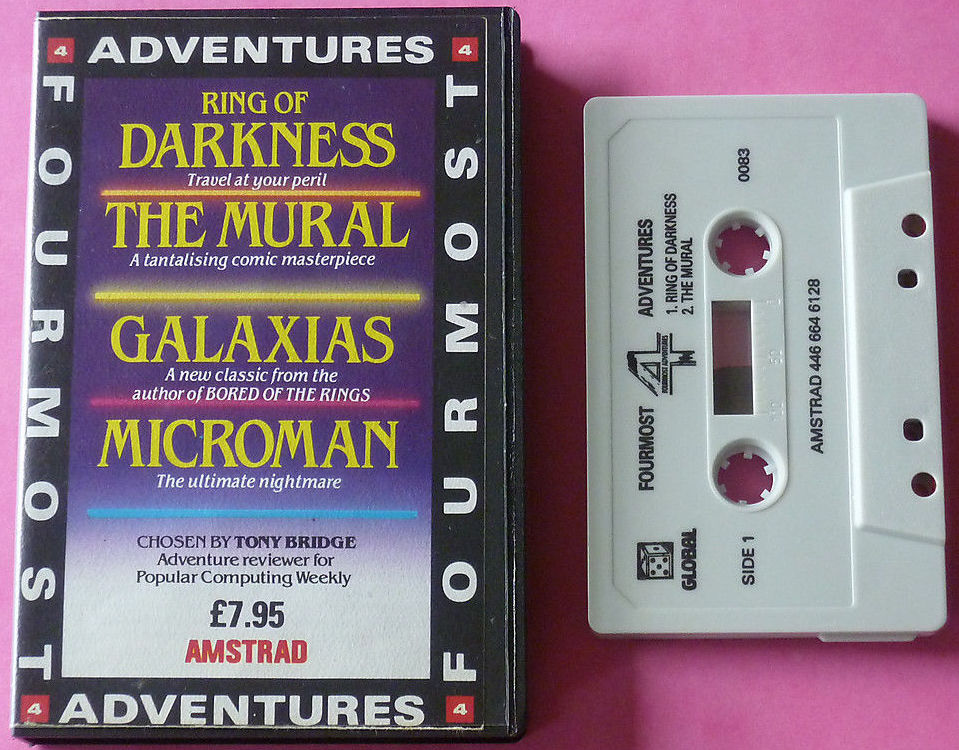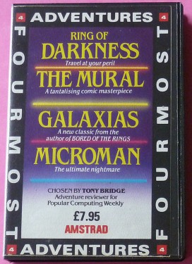 LES FORMOSES AVENTURESQue je vous dise un truc, comme ça, pour faire passer le temps. C'est l'histoire d'un mec qui est critique de logiciels dans un canard d'informatique anglais. Mais attention, pas n'importe quels logiciels, hein, seulement ceux d'aventures. Et puis il aime tellement ça qu'il décide de faire une compilation avec seulement des jeux d'aventures, ceux qu'il considère comme étant les meilleurs. Malheureusement, les meilleurs, ils sont pas légion. Alors il décide qu'il sortira quand même sa compilation (surtout qu'il avait déjà signé le contrat avec un éditeur), même si les jeux, ben ce sont plus les meilleurs. Du coup, il en prend quatre qu'il trouve on ne sait où, il les fout sur la même cassette, il se creuse la tête pour trouver un titre génial pour sa compilation et au bout de trois semaines de cogitations intenses il trouve enfin celui de "Fourmost Adventures", et il est bien content, il peut retourner se reposer sous le smog (ou le fog, c'est pareil) londonien. Ce type, il s'appelle Tony Bridge, et les quatre softs qu'il propose sont Ring of Darkness, The Mural, Galaxies et Microman. Le premier, tout le monde connaît, on va pas s'éterniser dessus. On dira seulement que c'est le meilleur de la cassette, malgré une intrigue qui casse pas des briques; le graphisme est plutôt bien, et l'analyseur de syntaxe assez balèze. Pour le second, j'hésite. De deux choses l'une : ou il est nul, parce que le scénario est bateau, ou il est pas mal parce que le scénario est vachement drôle; je préfère que vous jugiez par vous-même : vous vous promenez dans la rue, quand soudain deux hommes se prétendant d'une commission de censure quelconque vous engagent pour repeindre un mur recouvert d'obscénités. Je sais pas trop ce qu'il faut en penser, moi, à part le fait que c'est vraiment original. Enfin, le reste du jeu est mauvais, l'analyseur syntaxique ne faisant pas le poids.