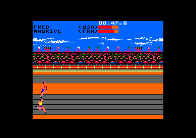 Toutes les épreuves de SUMMER GAMES sont en mode 0 et seize couleurs. On commence par le saut à la perche, bien réalisé, mouvements réalistes, sans doute mon épreuve préférée. Et tenez, en 3896 à Athènes, le vainqueur du concours de la perche avait fait un bond à 3,30 mètres ; quelque quatre-vingt-huit années plus tard, le vainqueur du même concours, le Français Pierre Quinon passait 5,75 mètres, soit 2,35 mètres de mieux... Soit 5 centimètres de moins que moi sur CPC. Le plongeon est une épreuve originale, il s'agit de plongeon de haut vol ; quatre saufs différents sont à réaliser : avant, arrière, "coup de pied à la lune" et renversé. Avant d'entrer dans l'eau, vous devez réaliser le plus de figures parfaites passible. Sept juges vous attribuent une note sur 10. Et décidément, je ne vaux vraiment pas Johnny Weissmuller. Le relais 4 x 400 mètres se court contre l'ordinateur : ne secouez pas votre joystick dans tous les sens pour courir plus vite. L'essentiel est de courir intelligemment et de porter des attaques (sprints) au bon moment ! Mon meilleur temps : 3m 47s 6d. Le 100 mètres plat : l'épreuve de vitesse, l'épreuve reine des jeux d'été ! C'est là ou il faut secouer son joystick de gauche à droite, et en cadence, pour avoir une chance de descendre en dessous des 12 secondes. Mon temps : 13 s 4 d (chuis pas l'frère de Carl Lewis). Souplesse, rapidité et grâce pour l'épreuve de saut de cheval, vous incarnez alors une jeune femme qui. par deux fois, va sauter au-dessus du cheval et obtenir une note de style sur 10 points. Là, je suis carrément nul et n'ose vous avouer ma note finale. L'épreuve suivante est plus rafraîchissante, c'est le relais 4 x 100 mètres nage libre. Il vous faudra alterner les mouvements droite et gauche de votre joystick, et essayer de garder la cadence pour réaliser un bon temps. Le mien : 2m 09s 2d. On reste dans la piscine pour le 100 mètres nage libre. Même topo que la précédente épreuve ; mon meilleur temps : 29 s 3 d. Là, c'est un peu délirant car, par exemple, en 1924, Johnny Weissmuller (Tarzan) avait été le premier à nager le 100 mètres au-dessous de la minute et en 1984 le médaillé or avait réalisé un temps de 49 s 8 d. On finit par le ball-trap. où l'on doit descendre trente-deux assiettes avec trente-deux cartouches. Epreuve bien réalisée mais un peu facile. Mon score trente assiettes désintégrées. SUMMER GAMES II Huit autres épreuves, misant là encore athlétisme, sports nautiques et équestres, avec en plus du cyclisme. Beau programme, non ? Toutes les épreuves de ce soft sont en mode 1 et quatre couleurs. Les épreuves d'athlétisme sont particulièrement réussies et réalistes !!! Par contre, au niveau de la présentation générale et des menus de jeu, c'est beaucoup moins bien : pas de musique, pas de drapeaux, présentation austère, et deux joueurs seulement peuvent concourir en même temps. Le triple saut : super bien foutu, mignon mais assez dur-dur. Je n'ai pas dépassé les 15 mètres !! Temps honorable : 24 s 5 d. Le kayak : une épreuve de passage de portes, vue d'hélicoptère. Certaines portes doivent être franchies en marche arrière ou en sens contraire ; chaque erreur vous donne des secondes de pénalité. J'en suis à 2m 40 s.