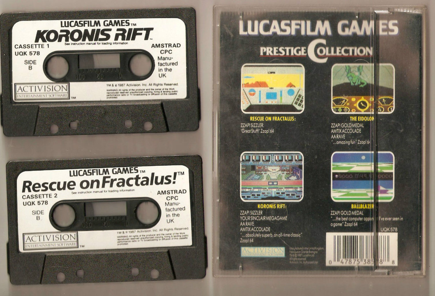 Vier inzwischen schon legendär gewordene Spiele für den CPC werden hier in einer preiswerten Sammlung neu aufgelegt. The Eidolon : Das Jules Verne-Abenteuerspiel. Mit einer geheimnisvollen Maschine gelangen Sie in eine unheimliche Dimension. In ausgedehnten Höhlensystemen, die übrigens in atemberaubender Fraktalgrafik dargestellt werden, leben ganze Scharen von Fabelwesen. Koronis Rift : Koronis, das ist ein legendärer Raumschifffriedhof am äußersten Ende der Galaxis. Nach den Gerüchten, die Sie gehört haben, soll es auf Koronis aber noch mehr zu holen geben. Irgendwo dort draußen befinden sich die Relikte einer unglaublich mächtigen untergegangenen Rasse und vielleicht sind Sie es, der sie entdeckt. Rescue on Fractalus : Nach einem wilden Kampf über der Oberfläche von Fraktalus sind einige Piloten abgeschossen worden. Die Kerle warten nun darauf, gerettet zu werden. Ihr Job ist es, über die zerklüftete Berglandschaft zu fliegen und die havarierten Piloten zu retten. Auch hier überzeugt wieder der Einsatz ausgesprochen sehenswerter Fraktalgrafiken. Ball Blazer : Das schnellste Spiel dieseits des Arcturus. Am Steuer eines Ball Blazers, sozusagen ein Schläger in dem man Platz nehmen kann und der sich wie ein Auto steuern läßt, treten Sie gegen einen gleichermaßen ausgerüsteten Gegner an. Ziel des Spieles ist, einen schwebenden Ball in das Tor des Gegners zu befördern, natürlich mit Ihrem Ballblazer. (hs), CPCAI