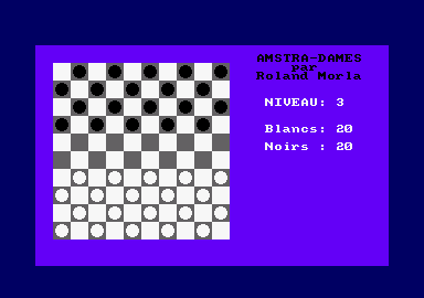 Décrivons ce que nous avons sous les yeux : un damier de cent cases, vingt pions noirs et vingt pions blancs... Si vous me dites que tous les éléments sont réunis pour l'aire une partie de dames, vous avez gagné le droit de revenir en deuxième semaine !... Dès le départ, chacun étant sur ses positions, un pion blanc s'avance le premier pour respecter la devise : "Honneur aux blancs !" Il sera bientôt suivi par ses compagnons, chacun d'eux ayant la prétention de traverser le damier en prenant les adversaires suivant les règles établies. Une fois arrivé à destination, chaque pion aura le droit de doubler de hauteur afin d'être nommé "dame" et d'obtenir ainsi de grands pouvoirs. Pour progresser dans de bonnes conditions, la règle d'or à observer est la suivante : chercher le plus possible à rester sur les bords du damier afin de se protéger au maximum. La réalisation de ce logiciel est réussie, le déplacement des pièces est facile. Par ailleurs, il y a suffisamment de niveaux de difficultés (7 exactement) pour donner envie déjouer aussi bien au débutant qu'à l'expert... Enfin, il faut noter qu'il existe des options qui sont très intéressantes : d'une part, vous avez la possibilité, avec l'option "Changement du damier", de choisir une position initiale afin d'étudier un coup particulier ou de faire résoudre un problème ; d'autre part, vous pouvez revenir en arriére lors d'une partie et ce jusqu'à 20 fois !... Pour terminer, je vous rappellerai que l'ordinateur respecte une règle que nous aimerions parfois ne pas connaître : "SOUFFLER N'EST PAS JOUER !" REVERSI Des pions noirs et blancs, un damier 8x8. Qu'est-ce que c'est ? Un jeu d'Othello (ou Reversi), bien sûr. Au centre du damier, se trouvent 4 pions, 2 blancs et 2 noirs. Un des joueurs choisit les noirs, l'autre est obligé de prendre les blancs. A partir de là, une lutte litanesque va s'engager entre vous et le cerveau électronique de l'ordinateur. Les noirs commencent et posent un pion de manière à entourer une pièce adverse avec au moins deux pions. Le pion blanc devient alors noir. Les joueurs sont tenus de prendre à chaque coup. Si cela n'est pas possible, ils "passent" (surtout en fin de partie). Le but est de posséder le plus de pions de sa couleur lorsque la partie s'arrête, c'est-à-dire lorsque le "damier" est plein. Le Reversi possède des règles simples, assimilables en quelques minutes. En revanche, les bons réflexes de jeu sont plus longs à acquérir. Cobra-Soft nous propose là une version claire de ce jeu de réflexion. Il y a même une option Anglais-Français pas vraiment indispensable. Par les autres choix, on trouve : la profondeur d« recherche qui varie de 1 à 8 avec, bien sur, augmentation proportionnelle du temps de réflexion. La profondeur en fin de partie permet à l'ordinateur d'assommer littéralement un adversaire trop confiant (de 8 à 12). Deux styles de stratégie A et B complètent les options se rapportant au jeu de l'ordinateur. Le volume du son est paramétrable de 0 à 7. A chaque tour de jeu, votre pièce clignote, les flèches – et – permettent de vous montrer toutes les cases que peut occuper votre pion. Un appui sur "ENTER" et c'est à l'ordinateur déjouer. Si vous êtes débutant, ne vous inquiétez pas si vous êtes battu assez souvent même au niveau 1 car Reversi est assez coriace.