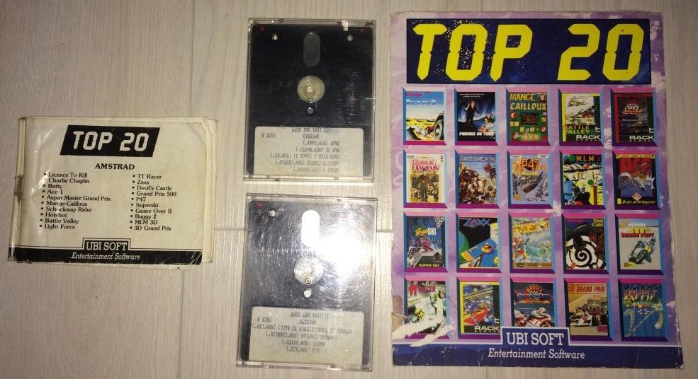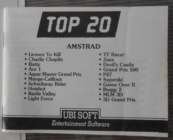 COMPILATION: TOP 20 [Buggy 2+Permis de Tuer+Mange Cailloux+Battle Valley+Light Force+Starring Charlie Chaplin+Game Over 2+P-47 Freedom Fighter+MLM 3D+ACE 1+Superski+Zaxx+Hot Shot+Devil Castle+500cc Grand Prix+TT Racer+Shockway Rider+Aspar Grand Prix Master+3D Grand Prix+Batty] (c) UBI SOFT★ LIENS VERS LES JEUX: - 3D Grand Prix