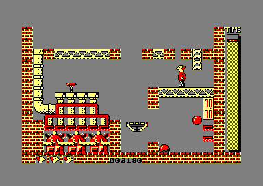 Contraption : le savant fou, inventeur de la machine ultime, court à la recherche des pommes d'or pour l'alimenter. Enième jeu à tableaux multiples, Contraption ne brille pas par son originalité. Le graphisme est réussi, les couleurs également, et l'humour n'est pas en reste. TILT n°30 (Avril 86) |