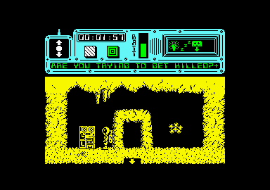 The Federation has a problem on its hands. Again. An unknown alien contingent is wiping out whole populations on asteroid colonies. Dastards! These asteroids used to be mined for fuels essential to inter-stellar travel, but now they provide accomodation for Federation Scientists who are harmlessly investigating deep space. Andrew Angello has been assigned the task of finding a reason for these attacks and you must aid him in his mission. Word has it that the aliens are planning an attack on Asteroid colony Eroc 1. But even as you speed towards your destination a message flashes onto the screen saying that it is already too late. The aliens have been and gone, killing every human in the colony. Now, the only way that Andrew Angello can throw any light on the mysterious attacks is by finding the Eroc 1 computer's bio-memory cassettes. These have been hidden deep within the old mine workings on the asteroid. Only by examining these tapes does the Federation stand any chance of planning an effective defence strategy against the abominable aliens. Andrew Angello is transported down into the wanen of abandoned mines on Eroc 1. There is no trace of the aliens except for various pieces of strange machinery that they have left behind as a sort of booby trap. Any contact with these saps Anaello's energy and prolonged brushes with them means death.