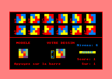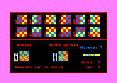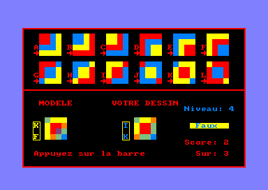 JEU DES MELANGES DE COULEURSSi vous savez ce que vous obtenez en mélangeant du rouge avec du bleu, ou du bleu avec du jaune ou encore du jaune avec du rouge : c'est que le mélange des couleurs n'a plus aucun secret pour vous. Pourtant, ce qui vous est proposé ici n'est pas aussi simple et vous trouverez certainement qu'à partir du niveau cinq, c'est de moins en moins évident. L'auteur a jugé bon d'avertir les utilisateurs que la vision des couleurs est assez différente selon les individus. Il peut donc être utile dans certains cas de modifier les couleurs de base (bleu et jaune). CPC HS n°16
