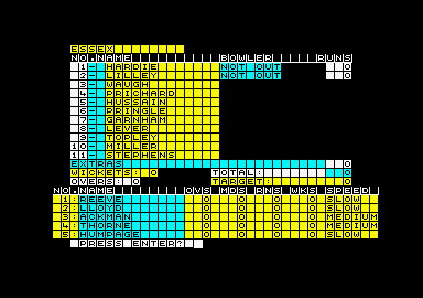 D & H Games, the self-styled "Masters Of Strategy" also produces Multi-Player Soccer Manager, reviewed in AA61. With County Cricket, it is remaining true to the text-only format was seen in that game. Once the program has loaded, you are presented with a choice of county sides. Simply select the one you wish to manage, input your name and away you go. There is a main menu, which will allow you to choose your team, train your men in whatever aspect of their game you feel warrants further practice, or view your fixtures over the season. The team line-ups are quite faithful to real life, especially considering that players come and go with more rapidity each season. Each player has several ability ratings, as well as data concerning his specialised skills, be they batting, bowling, wicket-keeping and so on. You can then select the order you wish your batsmen to play, and you can make substitutions to the team if you like. Training can also be set in one of four fields: batting, bowling, fielding and general ability. There is obviously a limited amount of training you can achieve in the short space of time before the season begins, though. Your first fixture is set, your men are ready, and the crowd is waiting (if they've bothered to turn up). Time for the toss. You may choose heads or tails (detailed, this bit) and if you win, you get to choose whether to bat or bowl. The computer has been using a rather nice scoreboard-style typeface to display all the data up until now, and once the game starts, you see... a scoreboard. This displays all the data needed to follow a match; who's batting and bowling, the score, when the wickets (if any) have fallen, and the overs bowled. At the beginning you can specify between 40 and 60 overs for the season's matches. The game progresses. Very, very slowly. Further investigation reveals that much (if not all) of the coding is in BASIC. This would account for the pedestrian gameplay. Each ball bowled takes several seconds, so an innings takes well over an hour. If you are batting, the computer will change bowlers regularly. You then get the option to modify your batting approach to suit the new bowler. For example, if the he is fast, you might want to adopt a defensive posture. These decisions constitute the sum total of your interaction with the game as it's being played. "Ah", you might exclaim, "isn't this rather realistic? Real cricket takes an eternity to play, too." This is true, but in real cricket there is at least something to watch during the boring bits, such as buses going up and down outside the ground or West Indians dancing because they're on the brink of victory (again). In County Cricket you are forced to sit and wait. After a while you start hoping that your batsmen are all bowled out just to hurry up the game. Cricket fans might initially be impressed by the depth of detail in the program, despite the lack of graphics or sound. A lot of accurate information is included, and the atmosphere is set for an exciting County Championship competition. It's a pity, then, that this excitement simply doesn't materialise. All inputs have to be made using the keyboard, and it is occasionally necessary to hold down a key in order for the computer to register it. This really sums up the whole program. Sadly, in the long run, even hardened cricket fans will find it difficult to sustain any enthusiasm for County Cricket. Mind you, at least you don't have to listen to Richie Benaud, though. James 'third leg' Leach, Amstrad Action |