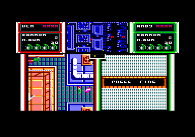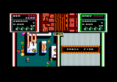 Vous avez heureusement la possibilité de vous aplatir contre les murs afin d'éviter les tirs des ennemis. Le seul problème véritable, c'est la petitesse des écrans de jeu pour les deux joueurs. Enfin, les graphismes sont justes lisibles pour que l'on ne puisse pas trop se tromper. Heureusement, le temps est un ingrédient qui apporte beaucoup de piment au jeu. AMSTAR n°48 Août 1990 |