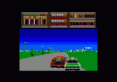 Très bien notée sur CPC, ST et Amiga, cette course-poursuite m'a un peu déçu sur la console GX4000. Crazy Cars II vous invite à rallier le plus rapidement possible un point de la carte affichée de l'un des Etats des Etats-Unis. Ce jeu possédait, dans ses autres versions, deux qualités essentielles : la possibilité de choisir ur itinéraire et de changer de route aux croisements, et la vitalité de sa conduite. Sur e console Amstrad, le pilotage est certes difficile, mais l'animation trop lente et la faible vitesse de défilement des arbres ou poteaux ne donnent pas le frisson. En revanche, la gestion des reliefs est respectée après les côtes, la route qui se dévoile au dernier moment est une trouvaille. En ce qui concerne l'étude de l'itinéraire, le jeu perd beaucoup de son intérêt car la position de votre voiture n'est pas vraiment signalée sur la carte. Crazy Cars II manque enfin de bruitages « moteur » ou » dérapage ». Même si c'est à ce jour la seule épreuve de ce type disponible sur GX 4000, je vous conseille d'attendre encore un peu avant de prendre le volant. Olivier Hautefeuille , TILT