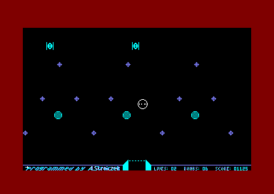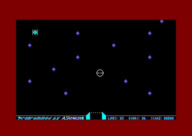 Moving from one extreme to the other, Crystal Mission (also by Mr. Stroiczek) is really twiffick! Unlike The Space Duel, Crystal Mission is a one-player game, and one in which you must manoeuvre a spherical droid around a variety of screens collecting a number of crystals. Once collected, the door at the bottom of the screen with open, allowing you to get to the next level. Ho ho ho! It's the usual case of 'Sounds pretty easy to me' syndrome. As per usual, there are a smattering of aliens to contend with and not to mention mines scattered about the screens to catch out those with slow reflexes. This is made just ever-so-slightly more difficult by the fact that your droid moves as if he's on ice. If you let it get out of control, you'll be bouncing around the screen until you eventually meet with a deadly object. The types of alien are varied, from simple drones that wander around minding their own business to these annoying cross-shaped gets that have an amazing knack of barricading you in with electric fences. Fortunately, you are not unarmed. You, have an infinite number of bullets that can be shot in eight directions and five smart bombs that kill every nasty on the screen. It is worth noting however that shooting or bombing an alien does not kill it. It simply returns to its starting position and waits a few seconds before starting off again. There are a total of 30 levels, starting off with a couple of easy starter stages and gradually getting to the point of anarchy. The only flaw is the lack of a password system. Having to go through each level again when you die can get quite tedious. Just a small glitch, nothing to really get stressed about - Quality with a capital Q, U, A, L, I, T and Y. AA