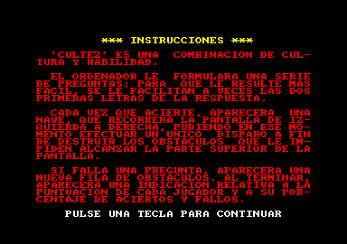 'CULTEZ' ES UNA COMBINACION DE CULTURA Y HABILIDAD. EL ORDENADOR LE FORMULARA UNA SERIE DE PREGUNTAS; PARA QUE LE RESULTE MAS FACIL, SE LE FACILITAN LAS DOS PRIMERAS LETRAS DE LA RESPUESTA.