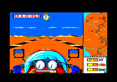 Après avoir fait un plein de victuailles pour ma moto et moi-même, respectivement nourriture et pièces détachées (ou plutôt le contraire !), je sens l'angoisse qui m'étreint en attendant le signal de mon départ... Il arrive enfin et c'est par un soleil (magnifiquement réalisé, il faut bien le dire) que je salue la capitale qui ne me reverra que dans un mois. Cinq autres concurrents étant partis avant moi, mon seul objectif est de les rejoindre et de les dépasser en ménageant au maximum ma "bécane". Bien entendu, je veux être la première à atteindre Dakar, mais il faut bien se dire que ce n'est pas en allant "tout schuss" que le but sera atteint. Je dois bien étudier le trajet que j'ai à emprunter et au besoin savoir prendre des risques dûment mesurés en prenant des raccourcis (mais uniquement lorsque cela semble judicieux car les raccourcis coûtent chers en pièces détachées). Je ne sais pas encore l'issue de la course mais une chose est certaine : j'irai contre vents et marées (pardon, vents et sables...) jusqu'au bout de mes forces... à moins que ce ne soit jusqu'au bout de mes pièces détachées... ou alors du temps qui m'est imparti pour faire tout le parcours !... Pour ce qui est de la réalisation de ce logiciel, vous prenez Dakar 4x4, vous remplacez juste le tableau de bord de la voiture par celui d'une moto et vous obtenez Dakar Moto ; je sens que, comme moi, vous vous posez une question ( qui a son poids ! ) : à quand Paris-Dakar en camion ?... Vous avez donc sur la partie droite de votre écran la carte avec le trajet que vous empruntez, votre position et celle de vos concurrents. Sur la partie gauche, vous êtes "sur le terrain", aux commandes de votre moto... avec la piste qui se déroule... infinie et monotone ! AMSTAR n°11 |