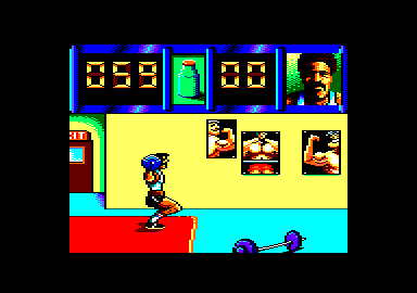 TOUT COMMENCE PAR L'ENTRAINEMENT Alors comme ça , on veut devenir champion sans donner de sa personne. Pas question, allez vous mettre en tenue et on se retrouve dans la salle d'entraînement. et au pas de course ! Premier amusement, les haltères. Et une. deux, une, deux... Vous allez me muscler ces petits bras. Chaque haltère soulevé vous fait gagner de la force, pour vous en convaincre il suffit de regarder le liquide remplir la bouteille ainsi que le sourire de Daley (oui. je l'appelle Daley). Ne ménagez pas vos efforts. Vous avez une minute pour faire le maximum de mouvements. Non. non. on ne s'arrête pas là : sans reprendre votre souffle, vous allez me faire quelques abdos, toujours suivant te même principe. A ce propos, toute la rédaction vous conseille de jouer au clavier, car au joystick, les gauche-droite incessants vous donneront rapidement des ampoules. Bon. comme vous me semblez en pleine forme, on repart pour le troisième entraînement, quelques flexions avec une barre bien calée sur tes épaules. Alors, que dites-vous de ces trois minutes d'effort intense ? RIEN NE VAUT UNE BONNE COMPETITION Allez, reposez-vous un petit peu et en route pour les olympiades. Avant d'entamer le 100 mètres, il faut prendre la bonne paire de chaussures. Attention, il y a quatre paires au choix, et si vous ne tombez pas sur la bonne, ce n'est pas la peine de concourir. Les épreuves de course sont classiques . mais la grande taille du personnage tes rend super-mignonnes. Le saut en longueur pose un petit problème supplémentaire. Après une course d'élan pendant laquelle il faut prendre le maximum dçevitesse, il faut cliquer juste avant la planche et relâcher le bouton quand l'angle voulu s'inscrit en bas de l'écran. Les lancers de poids, de disque et de javelot fonctionnent suivant te même principe. Pour le saut en hauteur, il faut courir jusqu'à ce que le joueur commence son saut : quand il atteint la hauteur désirée, on le fait basculer en appuyant sur le bouton. Il me reste à vous entretenir d'une épreuve : le saut à la perche. Le début est des plus classiques : une petite course jusqu à la ligne et là, surprise des surprises... l'angle de vue change. On voit te sautoir de face, le sauteur monte, monte, et, comme dans le précédent saut, il faut cliquer quand on estime que la hauteur est suffisante. Attention. si la course n'est pas assez rapide, le sauteur ne montera pas assez haut et.. c'est alors que Cent Pour Cent entre en jeu ! Si vous voyez que vous êtes trop court, continuez à appuyer sur le bouton : une seconde barre apparaît, il vous suffit alors de relâcher le bouton et vous passez à tous les coups (bou. le bug !).