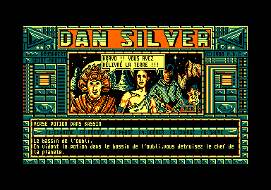 Dan Silver est un jeu d'aventure pour le CPC, qu'il est en mode un, qu'il a de jolis graphismes partout, que l'analyseur syntaxique a l'air d'être béton, et que l'aventure elle commence dans un laboratoire. L'ambiance est exotique et mystérieuse à souhait, et qu'est-ce que je peux bien raconter d'aufre, au secours. Non, soyons sérieux un peu. Dan Sylver se passe en 2020 où i! se pose un grave problème : un fléau décime la population. Un éminent scientifique pense que cela vient d'une mystérieuse planète, mais il meurt avant de pouvoir vous en expliquer d'avantage. Le sort de l'humanité dépend de vos, alors l! faudrait peut-être penser à se remuer un peu le cul... Je suis allé partout où c'était possible, même dans les sables mouvants, et je n'ai rien relevé de désagréable. Bien au contraire. Dan Silver m'a semblé autrement plus intéressant que Marmelade ou Frozarda, les deux premières productions MBC, qui n'étaient pas franchement géniales. De plus, il faut bien avouer que le petit rire digitalisé (en oui) quand le héros est mort est assez tordant. Sinon, je ne sais pas encore s'il y a un concours prévu pour Dan Silver, mais je vous tiens au courant dès que possible.