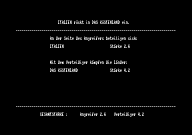 Geschichte einmal anders Nach dem Laden des Spieles präsentiert sich zunächst eine Karte, die die damaligen Grenzen der verschiedenen Länder und Fürstentümer anzeigt. Dabei fällt die unterschiedliche Farbgebung der einzelnen Länder auf. Weiße Flächen repräsentieren in diesem Zusammenhang Länder ohne Regierung, rote Flächen sind Besitztümer des Spielers. Ziel ist es natürlich, möglichst viele der anfangs weißen Flächen in das eigene Gebiet zu integrieren. Dazu bieten sich verschiedene Möglichkeiten an. Eroberungen führen zwar schnell zum Erfolg, haben jedoch den Nachteil, daß das eigene Land durch die unvermeidbaren Verluste geschwächt wird und in stärkerem Maße dem Eroberungsdrang anderer Länder ausgesetzt ist. Eine andere Strategie ist Abwarten. Auf diese Weise kann der Spieler das eigene Land stärken, Truppen bzw. Kräfte sammeln, um dann einen Vorstoß zu wagen. Der Spieler kämpft nun gegen bis zu 13 vom Computer gesteuerte Gegenspieler. Diese sind natürlich ebenfalls an einer Vergrößerung des eigenen Gebietes interessiert. Ein besonderer Umstand zeichnet die Truppen aus, über die Sic verfügen können. Die Größe des Landes ist dabei nicht entscheidend, sondern nur die Tatsache, wie viele Truppen des alten Weltkriegsheeres sich zufällig in dem betreffenden Gebiet aufhalten. Eine genaue Erfassung der eigenen Stärke ist also bei allen Eroberungsplänen wichtig, um einem vermeidbaren Desaster vorzubeugen. Resümee Nun ist auch die Zeit von 1870/1871 in einer Simulation erfaßt. Das Programm versteht dabei besonders durch seine präzisen Karten der damaligen Zeit zu begeistern. Leider sind die Interaktionsmöglichkeiten für den Spieler sehr begrenzt. Mit Hilfe der drei Optionen, die dem Spieler zur Verfügung stehen, ist es kaum möglich, alle Vorhaben umzusetzen. Eine Option für politische Verhandlungen wäre notwendig gewesen, da nicht alle Konflikte nur mit militärisehen Mitteln lösbar sind. Da die Simulation auch weitgehend selbständig abläuft, verbringt der Spieler den größten Teil der Zeit mit Zusehen. Für eine ernstzunchmende Simulation wird wenig geboten, jedoch darf der erzieherische Wert nicht außer acht gelassen werden, da der Spieler mit Hilfe des Programms seine Kenntnisse in deutscher Geschichte beachtlich vermehren kann, und dies auf spielerische Weise. Wer Interesse für deutsche Geschichte hegt, der sollte sich "Das Reich" einmal genauer ansehen. Allerdings ist eine Speichererweiterung notwendig. mm, CPCAI |