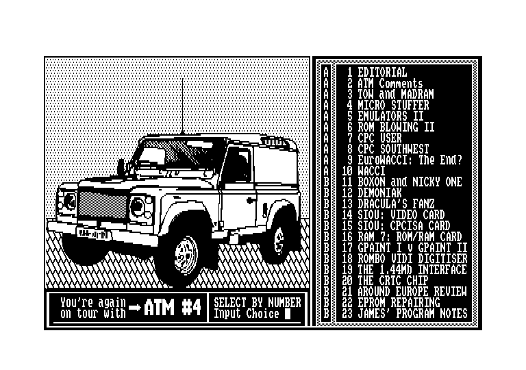 Sortie le 15 Février, voici la quatrième édition d'AMSTRAD TECHNICAL MAGAZINE, un de mes discmags préférés.On retrouve l'interface du numéro 3, à savoir un menu menant aux différentes rubriques, toutes en mode 2 avec des couleurs changeantes suivant la partie de l'article, ce qui rend le fanz très agréable à consulter. Il y a un défaut tout de même : l'image du menu ne se trouve que sur la face A, et elle doit être rechargée après chaque article. Quand on consulte les articles de la 2ème face, on est vite tenté de rester sur cette-ci, quite à ne pas avoir l'image et sélectionner les articles à l'aveuglette. Ceci rappelé d'ailleurs les 2 premiers numéros d'ATM ! En intro, les habituelles salutations, dont une semble confirmer l'existence de la version anglaise de BLACK LAND. L'édito est très complet, puisqu'il inclut des commentaires, des actus (la Palatine Démo serait-elle sortie ?), l'adresse de la rédaction, les résultats d'un sondage, et une très amusante classification des CPCistes, ceux qui répondent et ceux qui n'ont pas répondu au courrier de Roy. Très amusant (pour nous) car dans cette dernière catégorie se sont retrouvés Shap, Candy et Dracula, 3 des 5 auteurs de la lettre d'appel à la mobilisation CPCienne. Continuons la description : "ATM COMMENTS" regroupe les commentaires des lecteurs, et fait office de rubrique courrier. Je passe sur l'article 3 ! Puis vient le test d'un tampon 64k pour imprimante. Ca peut être utile pour une DMP, mais perd tout son intérêt pour les imprimantes récentes (que ce soit jet d'encre ou laser) qui contiennent souvent plusieurs Mo de tampon en interne.