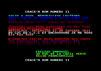 Crack'n ROM est un fanzine freeware, né en Janvier 91. Il compte deux numéros à son actif, le 3ème est en préparation. L'équipe se compose de 3 personnes et possède deux 6128. un 464+DDI+ext 64. Elle utilise OCP. des compacteurs et des utilitaires divers. Cependant toute la programmation est faite en BASIC. CPC INFOS- https://cpcrulez.fr