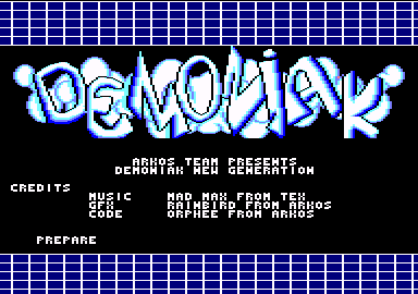 Commencons par DEMONIAK 4... Ce sont les auteurs de la BORDELIK MEETING DEMO 3, alors avant de commencer le test, je suppose deja que vous voyez de qui je parle... Non ? Mais d'ARKOS bien sur ! Allez, on commence. Tout d'abord, le numéro 3 etait deja pas trop mal, mais il y avait des bugs et le code principal etait en BASIC... Desormais, le singe est devenu homme et DEMONIAK est 100 pour 100 ASSEMBLEUR. Le fanzine tient sur une disquette bourrée à fond par des articles compressés. Chaque rubrique estcomme une mini demo ! Au fil de la lecture de DEMONIAK 4, vous y verez des vumetres, damiers, ondulations, rasters, animations, scrollings...