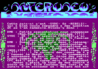 Et le texte ? Enorme ! Grace a DEMONIAK 4, vous saurez faire un writer digne de ce nom, vous saurez faire des ondulations et des rasters en BASIC, vous saurez decompacter un fichier compacté avec CROWN CRUNCHER ou CROWN IMPLODER, vous saurez programmer correctement avec le 3D CONSTRUCTION KIT, vous saurez tous sur les nouveautés, des fanzines et des demos... Je pourrais en faire des tartines ! Ce fanzine contient 15 rubriques plus 1 turn disc et 2 menu (bizarres au niveau des couleurs)... Et les defauts de DEMONIAK 4 ? Aucuns, ou presque... La rubrique EDITO n'est pas compatible pour les CRTC 1, mais bon, c'est pas bien grave ! Parfois, les couleurs sont mal choisies (la rubrique interview me chagrine un peu), la musique du menu de la face B est bizarre (mais cela ne manque pas, et même va tout a fait bien avec le dessin de fond)... Bon, voici le verdict final: DMK 4 est le meilleur fanzine sur disquette jamais vu sur CPC. Je crois que c'est clair ainsi, non ? Pour les contacter, voici l'adresse pour l'avoir... (Garanti 100 pour 100 sans fautes de frappes ou d'orthographe !). Ghoul's Fanz