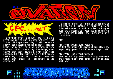 Alors commençons par l'intro. Hum, je vais plutôt passer directement au menu. Parmi les articles les plus intéressants, l'introduction d'un nouveau groupe grec du nom de S.O.B., un report de meet grec (avec un design différent du reste du zine, bravo! Dommage qu'il n'y ait pas de musique), une rubrique sur le design des démos, de l'électronique... Au niveau de la présentation générale, c'est pas mal fait. En haut un logo Ovation, au milieu deux grosses colonnes de texte avec une belle petite fonte, et en bas un logo Dirty Minds avec des vumètres à coté. L'interface est simple, mais dommage qu'il faille revenir en face A à chaque fois qu'on sélectionne une nouvelle musique. Enfin, compte tenu de la médiocrité de celles-ci ça ne vous arrivera pas très souvent je pense... En sélectionnant l'article 26, vous aurez droit à des extras. Tout d'abord deux morceaux digitalisés du groupe The Clash dont la qualité est surprenante (sans Soundplayer, on n'ose pas imaginer avec)! Vous verrez également des images scannérisées, et un slide show qui nous présente une bonne partie de la scène grèque. En conclusion, je dirai que Ovation est un discmag convenable mais qu'avec des articles plus en rapport avec le CPC (et plus longs!!!), et des meilleures musiques, il ferait partie des incontournables. Pour vous procurer ce fanzine, envoyez deux dises 3.5" (pas vierges, please!) à la rédac'. Le mot de la fin sera un remerciement à celui qui dégaine les disquettes plus vite que son ombre, j'ai nommé ELIOT, pour nous avoir swappé ce fanz. HICKS , Another World n°8 page 10