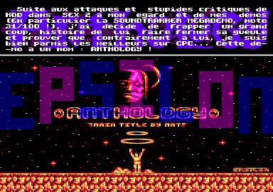 ANTHOLOGY: La plus belle production jamais vue depuis au moins 6 mois ! Epsilon a desormais atteint un bon niveau de programmation, il nous le prouve une fois de plus avec cette démo vraiment innovante. L'introduction de la démo est composée d'un effet appellé "Spectral Sprite". Ce sont des sprites qui se déforment verticalement sur toute la hauteur de l'écran. Un writer assez spécial fait son apparition entre chaques effets ! La seconde partie est composée d'un writer (avec un affichage original) ainsi qu'un gros logo Epsilon qui bouge verticalement lui-aussi. C'est assez dur de décrire cet effet, mais c'est assez esthétique à regarder, d'autant plus qu'il y a des mélanges de couleurs... La troisième et derniere partie propose de jouer 66 musiques directement accesible en mémoire: c'est un nouveau record !