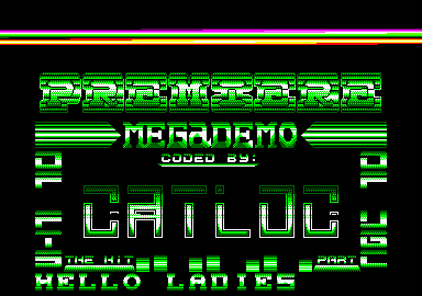 Allez, hop ! Passons à une autre demo... Je suis content car c'est une demo qui nous vient de Greece et qui s'appelle CATLOC PREMIERE MEGADEMO. Elle a été créée par CATLOC (on l'aurait deviné...). Il faut tout de même savoir que CATLOC est non seulement un de mes contacts, mais aussi le leader de la scene Grecque. Cette demo est composée de 6 parties, d'une introduction et de parties cachées. L'introduction est assez sympathique, on voit le titre de la demo sous forme de rasters... On vient ensuite au menu par pression de la barre d'espacement. La musique est geniale (elle provient du jeu XYPHOESFANTASY). Pour choisir une partie, il faut pointer une petite fleche vers un petit rond de couleur. C'est une idée originale ! En bas, il y aun gros scrolling. La premiere partie est... nulle. Un appui sur la touche ESC vous emmene à une partie cachée. Une zique de XIPHOES FANTASY et un logo qui bouge (grace aux registres) un peu vite. La seconde partie est belle (beaucoup de couleurs), mais j'aime pas la musique (tirée du jeu 1943). Pas de prouesses techniques là encore... La troisieme partie et la quatrieme sont cool, en overscan bien sur, mais je ne m'en souviens plus... Alors je passe à la cinquieme. Demo assez cool, avec un scroll hard qui scintille (pas fluide !). La sixiemeet derniere partie est une partie de JFMC (un autre Grecque faisant parti de CHAOS, groupe de CATLOC). Il y a un écran en overscan horizontal avec un petit scrolling et la musique de GRYZOR accompagne le tout... Dans la demo, il y a surement 3 parties cachées. J'en ai decouverte une dans le menu par hazard. Une musique SOUNDTRAKKER et de beaux graphes, et un scrolling... Bon, tous les scrolls d ela demo sont des scrolls hard sauf celui de la partie de JFMC. Toutes les parties sont en overscan sauf la premiere. Le seul point noir de la demo: les musiques. Le tiers des musiques sont nulles à chier ! Mais celles qui m'ont fait lever l'oreille sont excellentes. Cette demo est à posseder imperativement !