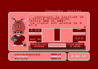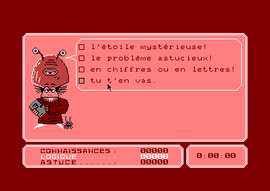 Un éducatif pour réviser tranquillement chez soi les mathématiques, ça existe et je l'ai testé pour vous (sans cachet d'aspirine). Ce logiciel, prévu pour les élèves de CE, CM et classes de 6ème, bénéficie d'une excellente réalisation et n'est jamais rébarbatif. Doté d'un bon scénario (une nouveauté dans cette catégorie de softs), il comporte en outre des exercices très variés. Votre naturel aventureux vous entraîne en l'an 2251 sur la piste d'embarquement du Centre Galactique Sirius. Hélas, les candidats pour le prochain vol ont déjà été désignés. Qu'à cela ne tienne, vous décidez de passer au-dessus de ce problème et de prouver aux savants que vous êtes le meilleur. Ils vous proposent des épreuves qui vous feront acquérir des points de connaissance, de logique et d'astuce. Vous ne pourrez décoller que si votre total atteint 7 000 points - pas facile ! Une fois l'écran de présentation digéré, vous êtes dans l'ascenseur de l'Institut : choisissez alors un étage en fonction de vos dons innés. Un professeur vous proposera à chaque fois toute une série de tests ; faites marcher au mieux votre encéphale de pierrot lunaire, sinon vous n'atteindrez jamais le firmament des grosses têtes. M.L. , Micro News 026 - Novembre 1989