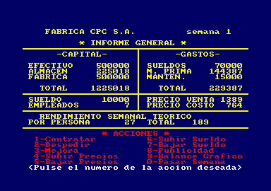 El programa trata de simular el funcionamiento de una fábrica de la que el jugador es director. El objetivo es equilibrar las ventas y la producción para obtener beneficios al cabo de las 54 semanas en las que tenemos la dirección de la empresa CPC, S.A. Si antes de las 54 semanas, el total de nuestro capital (EFECTIVO + ALMACEN + FABRICA) es menor de 0, se considera que la empresa está en bancarrota. Pueden surgimos cuatro tipos de imprevistos distintos: