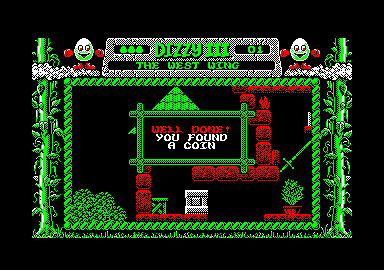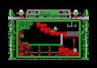 Pour le moment, je me retrouvai dans un cachot en présence d'un gardien à la stature redoutable. Je ramassai la carafe d'eau qui trônait sur la table, et en aspergeait le feu qui bloquai! la sortie sur la gauche. Je pris aussi une miche de pain qui se trouvait là, et quittai cette première pièce. J'arrivai près d'un cours d'eau infranchissable, aussi escaladai-je les rochers sur la droite, ce qui me permit de me trouvernez à nez avec un énorme rat. Puisqu'il me flanquait les miches, je lui filai la mienne et une fois repu, il me laissa la voie libre. D'un bond, je me retrouvai dans la hall d'entrée du château. Je gravis les escaliers menant vers la gauche, et actionnai le levier qui commandait la berse d'un écran précédent. Autant vous dire que j'eus rapidement compris le topo : tous pleins de petits écrans en mode 1, avec plein de puzzles à résoudre (quels objets pour quels obstacles), des pièces d'or à ramasser, une petite musique de DAVID WHITTAKER, et nouveauté : vous pourrez rencontrer les membres de la famille Dizzy qui vous fourniront une petite aide.