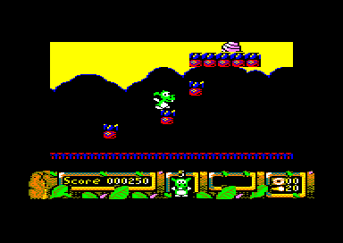 There's always a few immortal points that make a game worth buying and there are always areas that can make even the most hardened cutester throw up. (And what exactly, pray, is a 'cutester? - Act Ed) Maybe that is a bit strong, as DJP isn't that bad, it's just so irritating. Picture this... you're a happy little dragon, making your happy little way along a platform, when this friendly looking snail ambles up. 'Hello.' you say. 'Die!' replies the snail, and throws a bomb at you. You die. That's not very nice, is it? What happened to cute? Just how cuddly are we talking here? So niggle number one - why isn't there anything friendly in these games? Niggle number two - apologies to whoever coded this game (I hope he's not a pro boxer), but it has to be said that it's not brilliantly stapled together. Collision detection is a nightmare. All objects have square fields around them, meaning you can't judge any jumps. Breathing tire also seems a bit of a problem, because DJ only seems capable of tiring these little white yins. (Or 'yangs' as we like to call them. Yins are the dark ones. - Pedantic Act Ed) Life isn't all bad though... DJ is quite controllable, and though tailing is a bit too slow for comfort, DJ's responses to your waggles are really quite good. He can control his falls, breath fire in mid air, and land quite expertly on platforms (for a dragon). On the whole, you'll probably enjoy DJ Puff. but niggling gripe number three might mar it a little: it's way too easy to die. and you'll never get the hang of obstacles. You'll find yourself dying over and over again on stuff you managed to complete the first time you played. The Acting Ed's thinking of billing me for all the monitors I put my head through in anger while playing it. All in all. though, you'll almost certainly enjoy this game because it's got some lovely effects, an absolutely huge playing area, and a nice variation of cute baddies. But you'll have to gel over the initial obstacles of some quite sloppy programming before you can really start enjoying the tiner points of DJ Puff. It's just such a shame it's been so poorly programmed - if it had received a little more attention, it might have made the grade as another mediocre cute game.