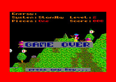 The robots are evil-looking purple things that can fly around anywhere on the screen and every time they touch you sap your energy level. Fortunately, though, you carry a laser and repeated hits on a robot will kill it, the number of hits needed depending on which of the three skill levels you're on. There are two basic types of robot that aren't distinguished visibly but by their actions. One will home in on you wherever you are while the majority hover around the doors making getting to them a hazardous prospect.