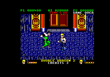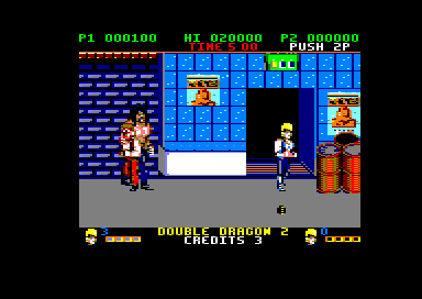 Pour cela vous devrez affronter les pires ennemis (punks, skinheads, rockers vous attendant avec des barres de fer, etc...). Tout au long de votre mission vous pourrez récupérer les armes laissées par vos adversaires (chaînes, barres de fer, couteaux...), ce qui vous permettra de combattre à distance. Alors n'hésitez plus et courez pour sauver votre bien aimée. Testé par Destroy, Joystick fev90, p110 Ping! Bang! Ahrgg! Sclachhhh! Dans las dents. Mais Qu'est ce? Un nouveau film de Schwarzy? Non, non ce n'est que Double Dragon II édité par Virgin Games.