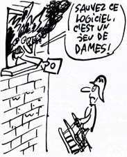 Et un jeu de dames de plus, un ! Ça se voit tout de suite que c'en est un, parce que c'est écrit sur la jaquette. C'est comme le Port-Salut, quoi. Traditionnel, à part le fait qu'on peut changer les couleurs comme on veut. Enfin quoi, je vais quand môme pas vous apprendre ce qu'est un jeu de dames, non ? Deux options se proposent alors à vous : passer directement au jeu, ou avoir un peu d'aide. Le jeu, on y arrive plus tard. Pour l'instant, on considère qu'on sait pas jouer. On nous explique d'abord comment déplacer ses pions : on nomme la case de départ et la case d'arrivée, et c'est tout, t Comme aux échecs. Ben ça , tombe bien, l'auteur de ce jeu est Chris Whittington, qui avait déjà " programmé le célèbre 3D Voice Chess. Ensuite, on a droit à tout un speech sur l'art et la manière de jouer aux dames. Les règles du jeu, quoi. Il faut quand même préciser que nous jouons à la version ? anglaise, c'est-à-dire qu'on a droit ni aux prises en arrière, ni à déplacer sa dame de plus d'une case à la fois. L'ordinateur est très fort, c'est la première fois que je vois un jeu de dames capable de jouer aussi bien. Je sais pas quel algorithme il a utilisé, le tonton Chris, mais alors là, chapeau. Même qu'au niveau débutant, il m'a foutu trois parties dans la tronche (et ailleurs !) sans se forcer. Pourtant, je crois pouvoir dire sans rougir qu'aux dames (et aux Dames !) je touche ma bille. Le seul problème, c'est qu'une fois qu'on a compris la technique utilisée, on le bat à tous les coups. Je vous rassure tout de suite : la technique change à chaque niveau de difficulté. Du bon boulot, quoi. Dames de CP Software (distribué par DDI) pour Amstrad. HEBDOGICIEL |