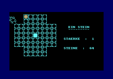 EinStein mit Senf und Arni Bei diesem Spiel, das vielleicht unter dem Namen “Solitaire“ bekannt sein dürfte, handelt es sich um ein relativ einfaches Strategiespiel. Zu Beginn befinden sich 64 Steine und ein freies Feld auf dem Spielbrett. Der Spieler nimmt nun einen Stein, springt mit diesem über einen anderen Stein und entfernt den übersprungenen. Gesprungen werden darf nur waagerecht oder senkrecht. Ziel des Spiels ist es, daß am Ende ein einziger Stein übrig bleibt. Die Bedienung sieht nun folgendermaßen aus: Der Spieler steuert entweder mit den Cursortasten oder dem Joystick ein kleines Kreuz. Durch Drücken der < COPY > - Taste oder des Feuerknopfs kann er einen Stein an wählen, dann fährt er auf das freie Feld und drückt nochmals dasselbe. Bei einer Fehlbedienung wird eine Meldung unterhalb des Spielfeldes angezeigt. Falls der Spieler nicht mehr ziehen kann, drückt er < E > für Ende. Es folgt eine Spielbewertung und die Punktezahl, die sich aus Zeit und übriggebliebenen Steinen berechnet. Außerdem wird der Spieler gefragt, ob er weiterspielen möchte oder nicht. Zuletzt noch eine Grundregel: Immer wenn das Programm hält, einfach eine beliebige Taste drücken! Damit das Ganze nicht zu trocken wirkt, begleitet den Spielereine Witzfigur namens “Senf“. Er ist, kurz gesagt, ein Möchtegerntrickser, der während des Spiels herumblödelt, sich über den Spieler lustig macht und andauernd seinen Senf dazugibt. Musikalisch untermalt wird das ganze mit Paulchen Panther. Zur Eingabe: Tippen Sie das Listing vollständig ab, und speichern Sie es vorsichtshalber auf Kassette oder Diskette. (Im Listing sind POKES enthalten, die, wenn falsch angewandt, zum Absturz führen können.). Das Listing selber ist leicht verständlich und durch die Remarks auch leicht veränderbar (Farben, Sound, ...). Die REM-Zeilen können weggelassen werden. Viel Spaß! (A. Huber/sr) , CPCAI   EinStein ist eine Version des bekannten Solitaire.