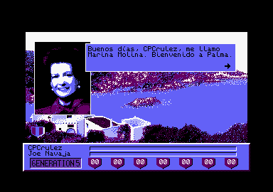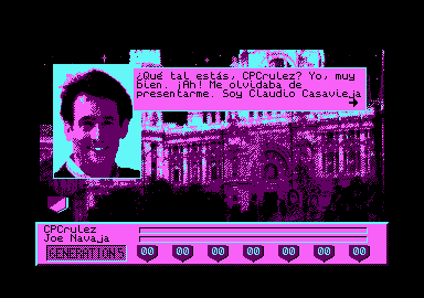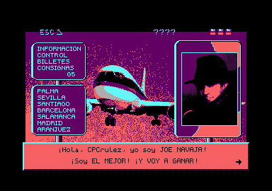 VOTRE PROF EST UN CPCHello les kids, ça boume ? Je sais bien que c'est les vacances, mais bon, il ne fauf pas laisser se rouiller vos jolis neurones que je devine pleins d'entrain à l'idée de travailler. Comment ça, non ? Eh, n'ayez pas peur ! Ce sont peut-être des éducatifs qui sont traités dans ces pages (bravo à tous ceux qui ne les ont pas tournées au premier coup d'œil, vous irez loin !), mais ils sont loin d'être ennuyeux. Et pour commencer : Viva Espana ! ESPANA SECRETA Sous ce titre sont regroupés deux logiciels : un pour les débutants (1e et 2eme années) et un autre pour les confirmés (3eme et 4eme années). Leur contenu, la difficulté mise à paît, est le même. Comme vous l'avez sans doute déjà compris, Espana Sécréta est un logiciel d'Espagnol dont le but est de vous permettre de maîtriser correctement la langue hispanique. Et pour cela, les machiavéliques programmeurs de Génération 5 ont usé sans vergogne de toutes les perfidies. « VINDIOU, ON VISITE DU PAYS... » Un scénario assez surréaliste nous est ici proposé : en effet, il y est question de pierre philosophale qui aurait été découverte par des alchimistes du Moyen Age. Cette fameuse pierre, en . plus de son pouvoir de transmuter tout métal en or, accorderait également le don des langues. Vous donc apprenez donc que cette pierre a été gardée par un grand maître en Espagne et vous décidez de partir à sa recherche.., en même temps qu'un ignoble individu connu sous le nom de Jo Navaja. Lequel d'entre vous deux sera le plus rapide? Au début de votre aventure, une série de questions en espagnol, se raportant justement à la pierre philosophale. vous sont posées, cela afin de déterminer si vous êtes apte à partir pour l'aventure. Si vous ne faites pas plus de deux erreurs, les noms de trois personnes résidant dans différentes villes d'Espagne vous sont révélés. N'oubliez pas de les noter. (Bon allez, pour éviter tout malencontreux oubli, sachez que vous devrez rencontrer Molina à Pahna, Casavieja à Madrid et Valente à Santiago). Mais ce ne sont que trois noms pour sept villes à parcourir...