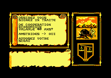 Le fin du fin est même de créer une fédération avec les Amstrides quand ils sont forts et développés. A quoi bon d'ailleurs se fédérer avec un état faible ? Un premier menu offre trois types d'intervention : politique intérieure, politique extérieure et aide des dieux. Deux tableaux, “rapport des espions” et état du pays, servent de source d'information et de comparaison entre les deux nations. Si l'on choisit “politique intérieure”, un nouveau menu apparaît. Il s'agit de prendre l'une des décisions suivantes, renforçant l'activité dans le domaine choisi : économie, autorité, culture, militarisation ou sédentarisation. En politique extérieure, trois points sont au menu pour l'instant : guerre économique, idéologique ou d'annexion. Rapidement, on s'aperçoit que le tableau des options de chaque menu évolue avec l'état de son système social. Ainsi, en politique intérieure, le changement d'activité principale, le changement de type de pouvoir et même l'urbanisation n'apparaîtront qu'après avoir franchi un certain nombre d'étapes. De même, en politique extérieure, la subversion, les traités de coopération et les possibilités de fédération ne feront leur apparition qu'après avoir acquis un développement suffisant. Le joueur a du mal au début à prendre en compte tous ces paramètres. Tout va à une vitesse hallucinante. Chaque tour de jeu renvoie dix ans plus tard ! Les émeutes, les disettes apparaissent, passent, disparaissent et les siècles s'écoulent. Les débuts sont durs et décevants, votre société stagne lamentablement pendant que les Amstrides décollent. Ethnos est un beau jeu, apparemment simple et très rapide de prime abord, mais qui cache en fait de nombreuses finesses. Sans doute aurait-il été plus rassurant pour les joueurs de mieux comprendre les décisions du programme, en affichant quelques commentaires par exemple. Mais nous avons apprécié. La société CHIP, plutôt tournée vers les jeux d'arcade jusqu'à présent, fait ici son entrée dans les jeux de simulation. Jeux & Stratégie |