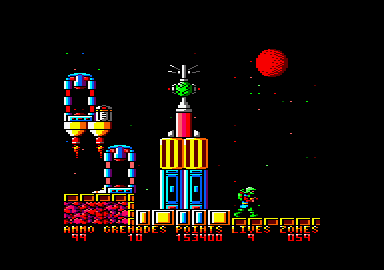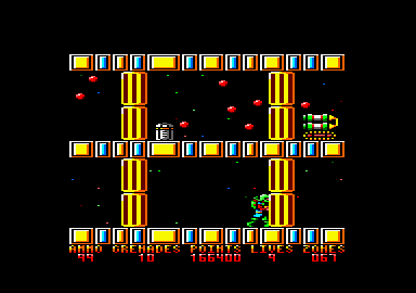 Pacifier l'espace Rien de bien original en ce qui concerne le scénario de ce programme, la recette de tous les jeux d'arcade spatiaux qui consiste à tuer tout ce qui bouge est une fois de plus appliquée mais, il convient de l'admettre, avec un évident brio dans le cas qui nous intéresse. En résumé vous vous retrouvez sur une planète inconnue et belliqueuse. Votre seul moyen de survie est de progresser en détruisant les différentes infrastructures, ainsi que les impitoyables attaques des « Aliens ». Pour votre œuvre pacificatrice vous disposez d'une mitraillette traditionnelle et d'indispensables grenades à tête chercheuse Lors de votre progression vous pouvez acquérir des caisses à munitions qui vous permettront d'assurer l'avenir Peut-être trouverez-vous aussi un exo-squelette qui est une sorte d'armure vous protégeant des agressions.