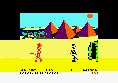 Perdu au fin fond de l'Egypte ancienne, courez au secours de votre princesse adorée. Cette dernière est enterrée vivante et va être l'objet d'un sacrifice offert aux dieux. Armé d'un glaive, vous allez affronter les guerriers les plus redoutables que la terre ait jamais connus. Ce logiciel de combat a su adapter à l'action un scénario fort intéressant. Commandé, soit au joystick, soit au clavier, votre guerrier manie-le glaive selon trois attaques : le coup droit la frappe haute et la frappe basse. Votre premier adversaire vient d'apparaître. Le gladiateur musclé brandit son arme et s'avance de quelques pas. Une feinte, puis c'est le coup à la tète qui coûte un point de vie à la victime. L'issue du combat dépend de votre quotient vital, qui ne doit en aucun cas atteindre le zéro fatidique. Chacun de vos succès fait apparaître un vase magnifique qui peut, soit vous emmener au tableau suivant, soit vous rendre tous les points de vie perdus au combat. Pour retrouver la princesse, tuez des vampires, des chiens enragés et autres adversaires. Sur un graphisme soigné, les différents tableaux font preuve d'une animation fort réaliste. Fighting Warriorse pose d'ores et déjà comme un très bon simulateur de combat.