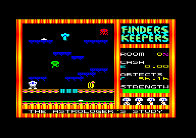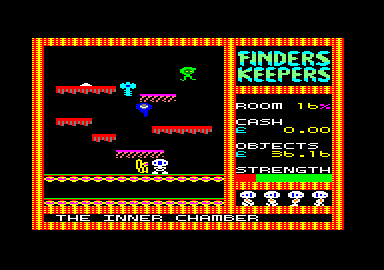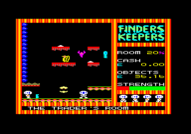 The King of Ibisima just doesn't know what sort of present to give his daughter Germintrude for her birthday. Instead of nipping down to the local Ibisima Woolies to scan the shelves for a suitable gift, he sends you. the Magic Knight, out on a quest to find a fitting gift. If you succeed vou will become a Knight of the Polygon Table... if you don't then forget the thought of ever going back to the palace. Finders Keepers first appeared on the Spectrum and was Mastertronic's first game (for that machine) of real quality. Its transfer to the CBM 64 was even more triumphant and proved the point that excellent budget software was here to stay. What of the Amstrad version? You start the game with the King waving you to a transporter. Step on this, and you're magically transported to Sprite-land, an alien-infested platform world packed with valuable items. The resident aliens sap your energy which is shown on screen in the form of a bar. if you're not careful and the energy reaches zero then you lose one of your five lives. There are many objects scattered around the landscape which form an important part to this game. These all look the same, being little white triangles but if you stand on them and use the examine command then you are told what the object is. If you consider the object might play a useful part in the game you can pick it up. rather like a true adventure game. You can Finders Keepers from two viewpoints. If you wish to comply with your King's wishes then you need to trade different objects until you have a prize fit for the Princess. If, however, you are willing to commit a bit of treason then you could always enter Spriteland as a free agent, working only for yourself. Once you've stacked up a reasonable horde you can leave the castle for a life of luxury Finders Keeper is an arcade adventure platform game featu ring a wealth of screens. Though involving a lot of arcade elements. the adventure side of things is very similar to the traditional style of adventuring. To attain any status you have to trade objects at a profit. In some cases if you collect two objects they may interact, combining to leave you with an even more useful item. A philosopher's stone and a lump of lead, for instance, leaves you with a much more valuable lump of gold. Also, as in traditional adventures, there's a limit to how big your inventory may grow, the maximum amount of objects you can carry being five. Around the game you come across traders willing to barter their wares. Using the traders it's possible to turn apparently useless objects into very useful ones by buying items that interact The screens mostly take a standard platform-type format involving pixel-precise jumps from ledge to ledge. If you do 8 bit of exploring it's likely you may find at least one of the two mazes in Spriteland. The mazes scroll around you keeping your knight central, a system reminiscent of that employed in Boulderdash The scoring system is in two parts displaying a percentage of how many rooms have been explored and the amount of cash you're worth. The screen display shows how many lives you are left. Control keys: Cursors for movement, G to get; T to trade; D to drop; E to examine. CRITICISM Finders Keepers is a first rate piece of budget software The standard of programming plus the interesting gameplay make this one a winner. It puts a lot of software houses to shame especially those who try to peddle their substandard wares around the £10 mark The graphics are of a high quality with a good standard of movement, though the way Magic Knight jumps could have been better Screen movement is smooth and unflickery. Very good as well with the variety in terrain with the maze and platform screens intermingling. Overall one of the best pieces of budget software to date and gives a timely reminder for other software houses to pull their socks up! 3. Its appearance on the Spectrum was something of a revelation, as at that time no one thought budget software could produce anything reasonable. But Mastertronic have improved the game even further with the Amstrad version. The arcade elements are well up to standard, requiring some skill and good timing. The adventuring and trading bits blend in perfectly, and it can take some time to work out how best to qo about playing the game. Playable then, attractive to watch and strangely addictive.