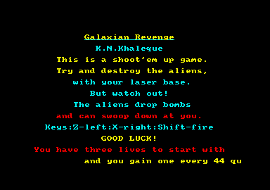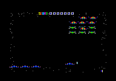 The deadly invaders are once again threatening Earth. Beaten off the first time, they have regrouped their modified ships into the familiar attack formation. Only by blasting them out of the sky, as they swoop toward you, can you save the world from destruction. This colourful sprite game will keep you and the kids amused for hours. To get it running; type in listing 1 which is the Basic part of the program. Save this onto a blank tape. Don't rewind the tape after it has saved. Type in listing 2 which is the machine code file creating program. When this runs without errors it will save a machine code file onto the tape after the Basic program on the tape. It is probably a good idea to save the machine code creator as well, on a seperate tape. If you have made a mistake typing in the numbers you will be told which line to correct. If you have made a major mistake in the data you will get a Type Mismatch Error. To find out where the error is type "PRINT LN", the number which appears on the screen is the approximate linenumber for the error. Once you have got the game working, the controls are Z to move left, X to move right and SHIFT to fire the laser.