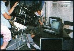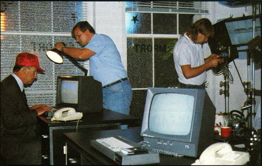 In between takes, it emerged that John spends much of his time writing, and was therefore interested in finding out more about the PCW8256, and he even went as far as suggesting a theme for the next commercial featuring a middle aged actor/writer...... In fact, this completely bears out the Amstrad philosophy on the PCW8256 - for while computer specialists are agonising on determining the nature of the marketplace and the conflict with £3000 systems, potential customers who would never previously have thought of setting foot in a Computerland or First Computer store are lining up, eager to lay hands on their first wordprocessor/computer. The Good the Bad and the Ugly On a personal note, I find commercials that use 'real life' customers to be unwatchable - and commercials that fail to extol the practical virtues of the product to be quite meaningless - although with products like beer, the ever cautious ITCA (the vetting body) would frown upon a tag line to a commercial along the lines of 'OfTenSlosh gets you gloriously merry' so the commercial tends to be as watered down as the product. Computers have been advertised in a variety of indifferent ways. The Barbara Woodhouse training session, the Commodore Elephant, the Hewlett Packard ads all tended to extol a virtue that was by no means proprietory. The Commodore elephant, for example, looks distinctly vunerable to anyone coming along with a bigger memory product (what price a perfectly preserved Mammoth from Siberia, eh?); and anyone can make outrageous claims about software because no-one really has the time to sit and evaluate a business product properly. And when you do, the result is usually very subjective. The Amstrad 6128 advert manages to extol a couple of typically Amstrad virtues that Amstrad has made almost proprietory in this market, and pointing out the utility of the product at the same time: value for money, and value for money. Softaware Amstrad is the first company to advertise software on TV in a sizeable campaign. (Ocean ? Virgin? Global? - Ed) After the indifference of some of the earlier offerings, Amsoft has actually got a few good-uns together under the Amsoft Gold label, prompting the thought that the rest of the range might uncharitably be described as *base metal'offerings. The software ad was shot in between two days of the 6128 commercial, with Dominic Murphy as the ubiquitous Bob Wilson, and definitely not at all anything like Dickie Davies. I must make this clear because the original intention was for him to appear with a white fleck in his hair like the 'real thing' - but the ITCA said this was not on. I'm glad I don't have to deal with the ITCA for a living, although Greg Delaney insists that the ITCA is a very necessary and wonderful watchdog body with the interests of the general public at heart. (OK, Greg?) Phased out The software ad was made up from set pieces, and so was rather easier to shoot than the action sequence of the 6128. The only problem was the synchronisation of the camera shutter with the TV monitor scan rates. The problem is that the scan rate is linked to the crystal reference in the computer - and although near as dammit 25 frames per second - the difference between shutter speed at 25 fps causes a phase difference to appear as a black band travelling up or down the screen. You must have seen them on TV news reports or other programs without our attention to detail. The results were actually rather good, as you can see for yourselves if you watch TV-AM. Glitter City The actual studios were in Shepherds Bush, but we're allowed a little licence in this business. Contrary to the expectations of many, attending a commercial shoot is about as enthralling as watching paint dry (you have to quite a lot of that, too). In fact, it's very much flying the Atlantic, great anticipation but boring once you're in the air. Like a transatlantic flight, refreshments come along regularly every couple of hours, starting with breakfast, midmorning snacks, lunch, afternoon tea, supper (these events tend to drag into the evening). If some of the accompanying photographs seem to dwell rather heavily on this aspect of the production, it's because the food was one of the more memorable and lasting features. Shooting a commercial is a trial of many things, not the least of which are stamina and patience.