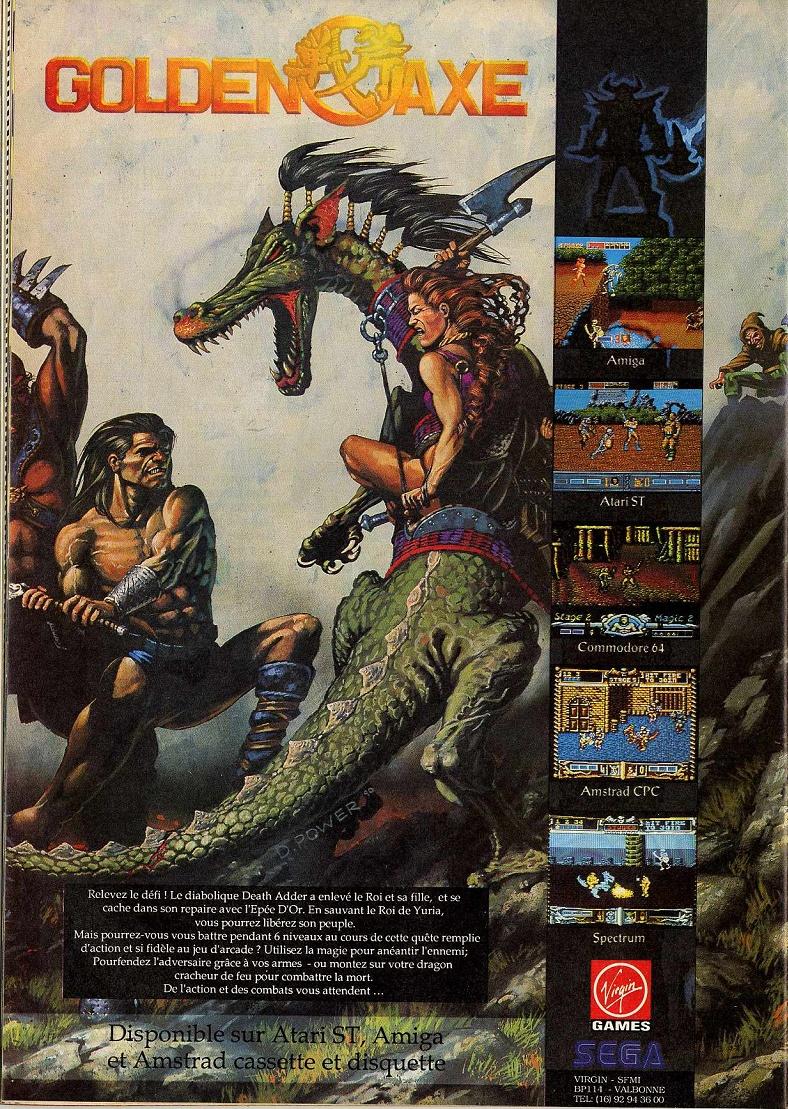 DES COUPS SPECIAUX Outre le maniement des armes, votre personnage peut également charger un adversaire. Cette attaque, moins meurtrière qu'un moulinet d'épée, est pourtant hautement recommandée. Elle permet d'être toujours mobile et de se débarrasser plus rapidement de vos adversaires. Le combat à l'épée, bien que plus efficace, exige de rester au même endroit durant deux à trois secondes, secondes durant lesquelles vous serez vulnérable et que mettront à profit les sbires de Death-Adder pour vous porter un coup en traître. Certains de vos adversaires utilisent d'étranges montures. Vous pourrez, vous aussi, les monter après avoir désarçonné leurs cavaliers. En appuyant sur le bouton de tir. vous utiliserez alors cet atout supplémentaire ; le souffle carbonisant d'un dragon par exemple (très efficace pour exterminer rapidement une fournée de méchants). VRAIMENT PRENANT La décomposition soignée des mouvements des sprites, ajoutée à la variété des coups, rend le jeu agréable et prenant. Cependant, la fausse perspective utilisée et certaines scènes quelques peu fouillies rendent les combats hasardeux. Dans le feu de l'action, il est parfois peu aisé de distinguer un déplacement vers le fond de l'écran d'un saut sur place. Malgré ces quelques défauts, cette adaptation du hit de Sega est très prenante et Ton entre vite dans le jeu. Seules les brèves coupures dues au chargement des différentes parties de l'aventure laissent à peine le temps de souffler. Ce grand classique de l'arcade devient vite un challenge pour tout amateur d'arcade-aventure, et de longues heures de jeux (ou plutôt de bas-ton) vous attendent. Une fois surmontées, les premières difficultés de jouabilité ne seront plus qu'un bon souvenir en comparaison de ce qui vous attend. Wolfen GOLDEN AXE de VIRGIN GAMES Wolfen, A100% n°33 JAN91, p16 |
